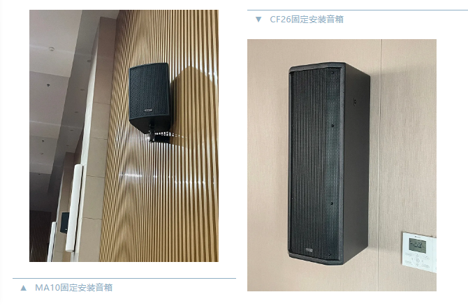 本次项目中两间多功能报告厅,宴会厅的主扩声系统均采用Mission Pro(英国美声)MA系列音箱系统,新闻发布室、情景实训室及9间教室,均采用CF系列固定安装音箱系统,会议室采用CV6-16吸顶音箱,本次项目所有场景的驱动扬声器系统皆采用MI系列数字功放。
