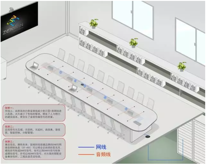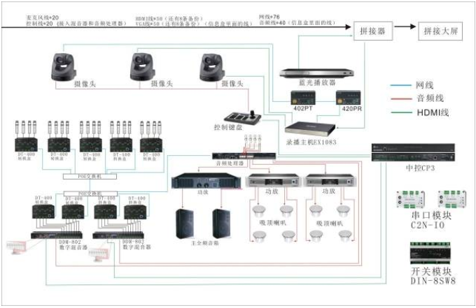 布线上,由原来的20条音频线减少到只需1条网线进入机房,大大减少了布线的繁琐,降低了人力物力的建设成本,更优化了音频传输信号的质量;