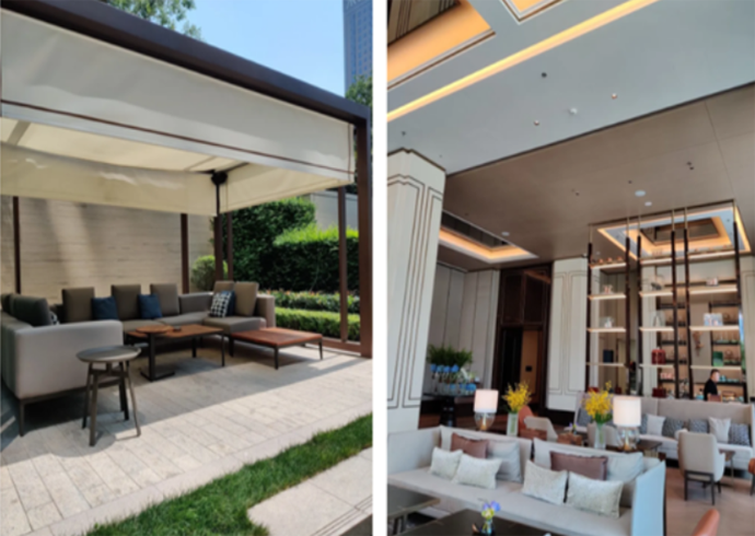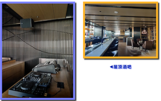 27楼屋顶酒吧Flair,分室内室外两部分,配置DJ打碟机,主扩声由EV SM系列全频同轴+15寸超低音组成,室外视野极佳,就坐于池水边。身边绿植丛中隐藏的EV 8寸蘑菇音箱同步播放室内音乐,品美酒赏夜景甚为惬意,开业即成为高新区的一个新的网红打卡地。