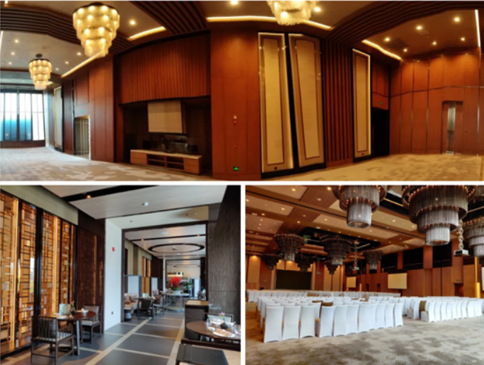 酒店一楼设有大会议室一间、小会议室两间、董事会议室一间。扩声采用了EV 6.5寸二分频吸顶音箱,与Dynacord 数字系列功放,Roland数字调音台组合的音频系统,满足本地会议和远程会议的使用。会议室的视频设备均采用了EPSON系列高清工程投影机,高分辨率、低失真、低色差、高透光率等出色的性能,将色彩还原到极致。