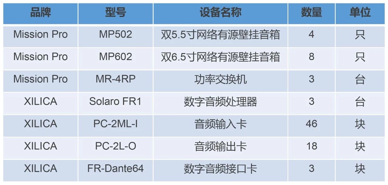 考虑到该项目的实际需求,前期结合工程图纸与项目方进行了充分沟通,通过与同类产品的多次对比、多次测试,最终选择了先歌国际旗下拥有40多年先进迅雷AV黄色成人麻豆经验的英国知名音响品牌——Mission Pro美声网络音频系列产品,以及专业从事设计、研发和生产高性能DSP音频处理系统17载的国际知名品牌——加拿大XILICA Solaro FR1高端数字音频处理系统。
