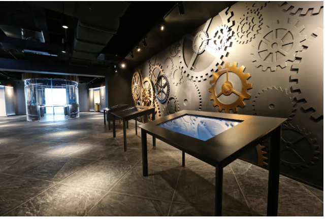 二层为钟表文化体验展厅,该展厅由五个部分组成:临展区:预留投影面、展柜位等空间,满足临时主题展览灵动可变的展示需求。多媒体互动区:通过声光电一体化的多媒体系统介绍腕表的历史与设计演变。手表材料与机芯展示区:通过空间沉浸式造景设计对手表机芯及手表不同结构材料进行展示。机械互动体验区:通过空间造景和多媒体展示,打造虚实结合的体验场景来介绍手表机械装置和工艺。手作体验区:手表拼装体验。