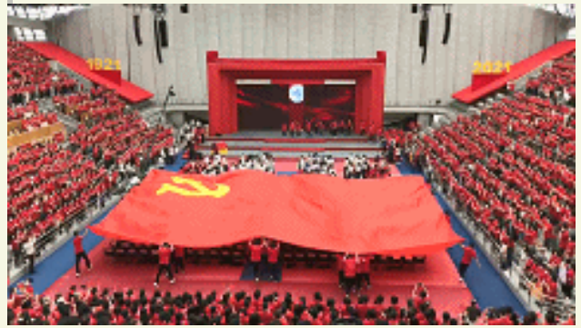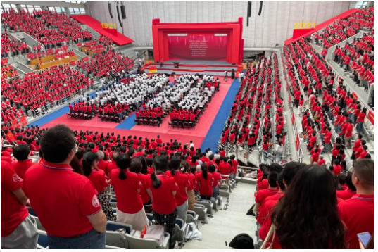 昂扬的歌声通过EV音响系统撼动了在场所有人的心灵,将主题党日活动推向高潮。活动最后,在100位新入党党员接力下,一面党旗在内场缓缓展开。这面党旗在复旦飘扬了一百年,象征着共产党人的精神和力量,是复旦人的信仰和方向。