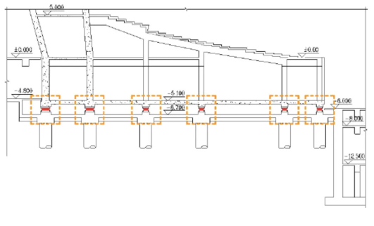 其次,歌剧厅建造时需要对地基作特别处理以消除结构传播噪声(ground-bornenoise),即附近地铁、路面交通等振动带来的噪音。图中黄色虚线框起的阻尼器将结构震动带来的动能转化为热能,加速垂直方向振动频率的衰减,从而降低噪声影响。