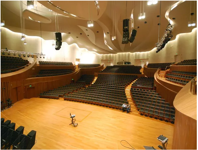 例如,江苏大剧院音乐厅就主要采用的是线阵列扩声器,在场地较小、辅助扩声器较少的情况下也能覆盖所有观众席位。