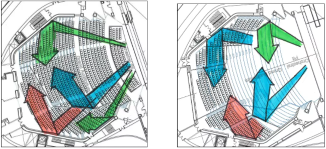 下图是歌剧厅的一阶反射声,即声音从麻豆三级片免费观看扩声器发出后经过第一次反射的路径分析。从各个箭头的指向与长度可以看出,声音到达各区域座位距离、时间相当,也就是各区域观众都能有相似的听觉体验。