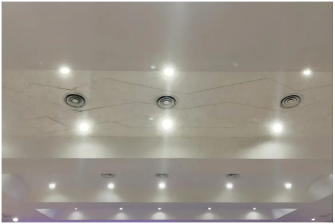 考虑到高层观众离天花更近,回音影响更大,在骑楼、高层处的天花与墙面需要更强的吸音效果。设计师巧妙地将空调回风口与灯架一起设置在天花板与两侧上方,既完成了座椅下送风、顶棚回风的节能空气处理系统,又通过凹凸不平的墙面削弱了回声。