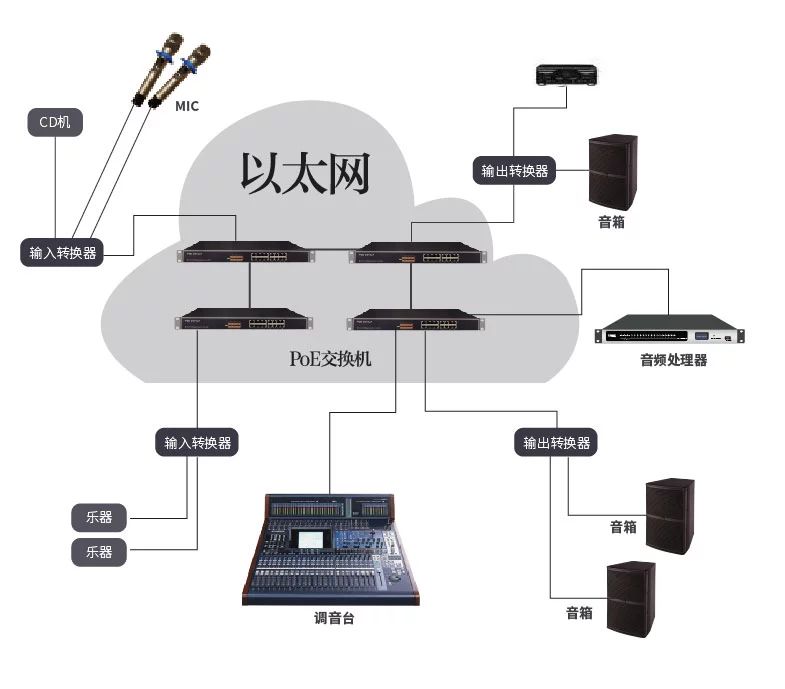 音频信号通过专用转换器转换成TCP/IP网络信号并传送到网络中,音频信号以数据包的形式在网上路由到任意的输出转换器,并转换成模拟信号提供给扬声器或者记录设备。对于一些处理设备,如数字处理器和数字混音台等,则无需数字、模拟转换,而是直接在网络环境中处理数据包,并以相同的TCP/IP数据包返回网络中供其它设备使用。