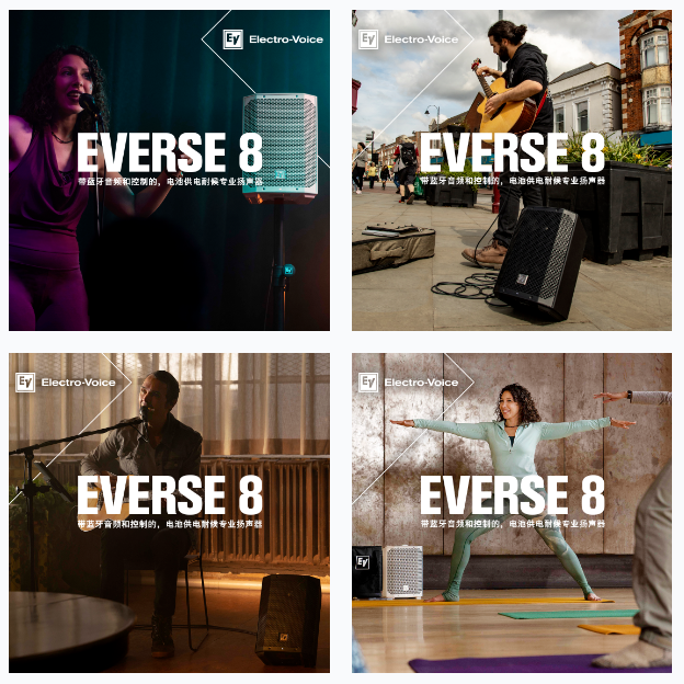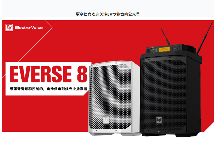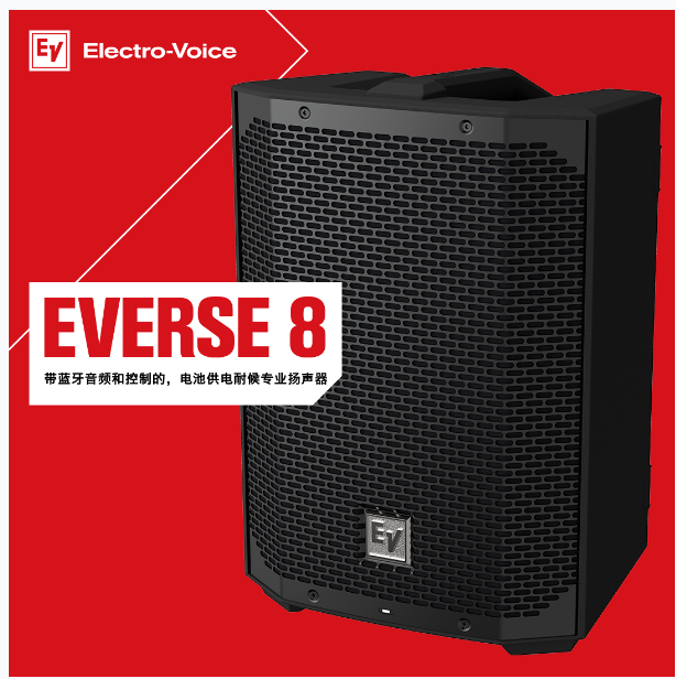 EVERSE 8 的最大声压级额定值为121 dB,覆盖范围达到100º x 100º。其核心组件包括一个使用EV专利SST(信号同步换能器)设计安装的8英寸低音单元,以及一个安装在定制恒指向波导上的高输出钛高音单元。EVERSE 8由EV兄弟品牌Dynacord的世界级音频电子工程团队合作开发的高效能D类放大器和DSP模块驱动,其专业功能包括内置具有录音棚品质的4通道数字调音台、48V幻象电源、反馈抑制和音频闪避。EVERSE 8的系统可靠性,已通过大量严苛实验和耐久性测试得到验证。