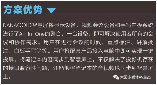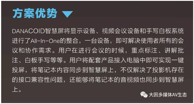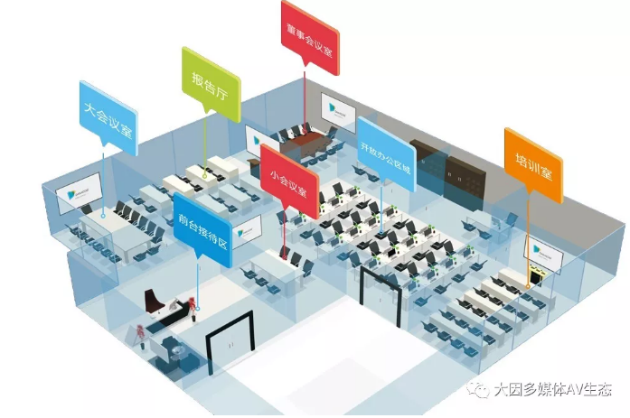 现代型会议室最基本的用途是讨论会议、视频会议、工作汇报等。因此需要满足会议语言类的扩声和视频显示的功能。同时如果作为分会场使用时需要满足把主会场的音视频信号实时的发送到会议室来。
