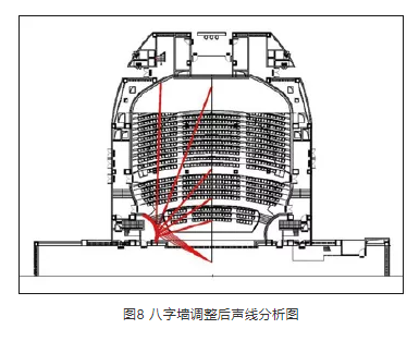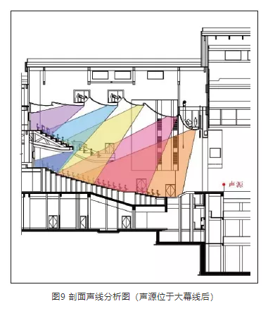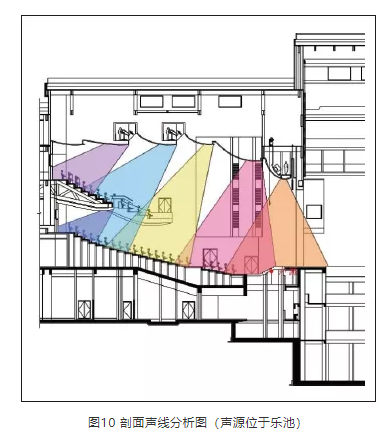 观众厅剖面设计取决于两个因素。一是规范规定的每座容积,它能确定观众厅吊顶的大概高度;二是观众厅剖面声线分析,它能确定吊顶的最终形式。结合上述两个因素,最终确定的吊顶形式如图9、图10所示。可以看出,经吊顶反射的声音能覆盖观众席的所有区域,其分布均匀,能达到良好的声场效果。