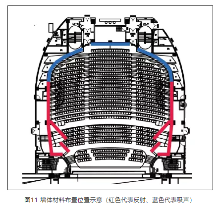根据确定的混响时间值,对主剧场观众厅进行声学材料布置,同时遵循室内声学材料布置原则,确定观众厅空间以下部位的材料及构造做法。