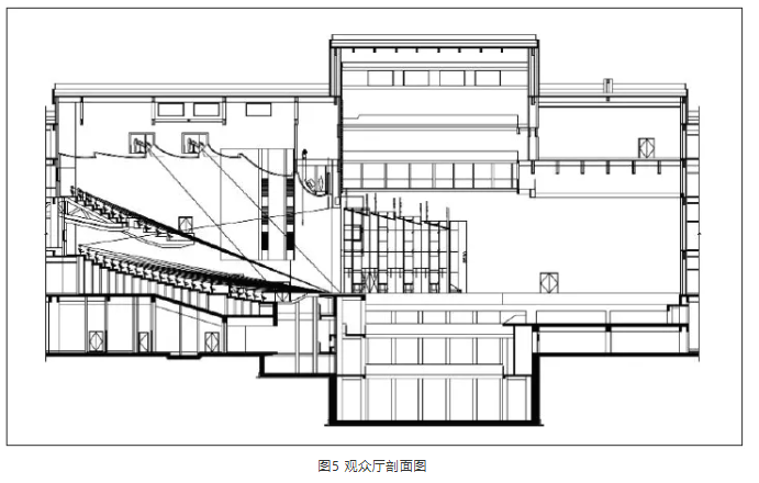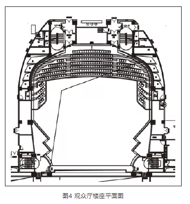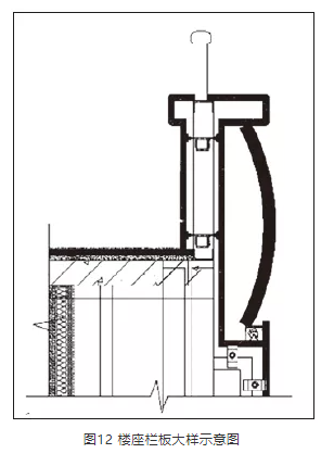 楼座栏板应避免垂直面,做吸声或扩散处理。根据观众厅混响时间控制,以及结合内装装饰效果,在栏板部分做弧形扩散处理,大样示意见图12。