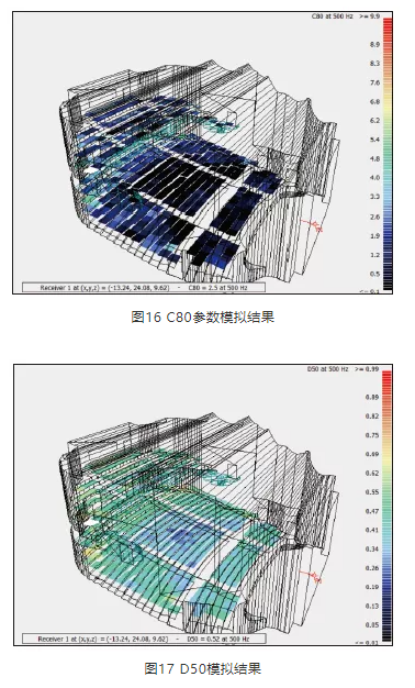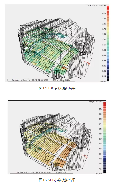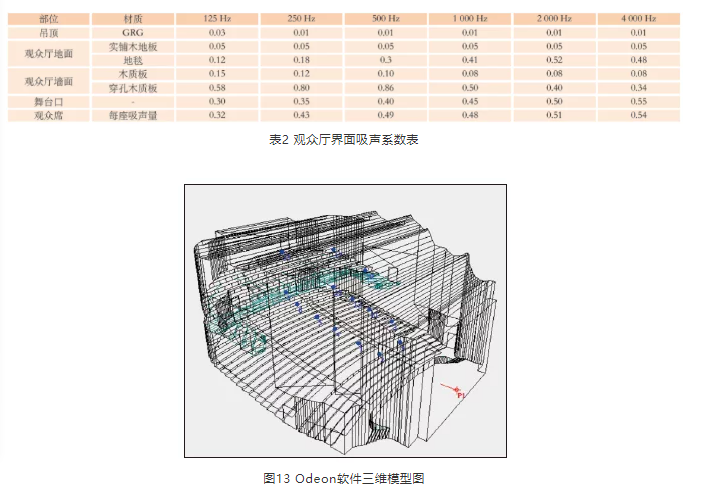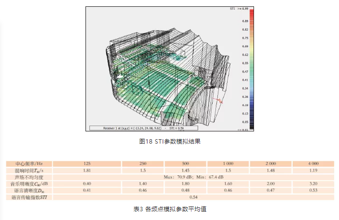 混响时间设计完成后, 采用Odeon软件对声场环境进行模拟,对方案起到一定的校正作用。观众厅各部位吸声系数见表2,图13为模拟软件中三维模型图,图14~图18为各参数的模拟结果,表3为各测点平均值。