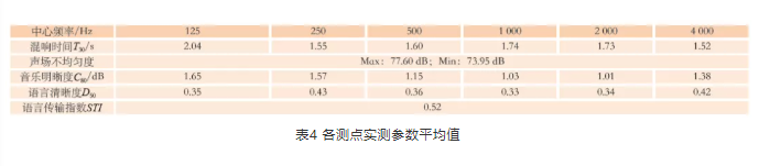 根据混响时间测量规范,在观众厅内共布置17个测点,对主剧场进行空场竣工检测,各参数检测结果见表4。