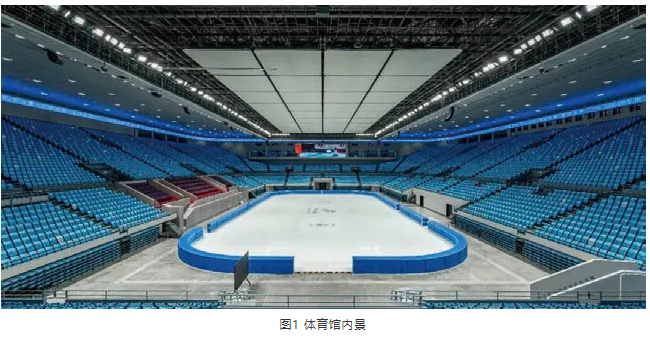 2022年北京冬奥会的主要比赛用馆首都体育馆,其建筑面积45 406 ㎡,其中,地下一层为38 842 ㎡,地上四、六层6 564 ㎡,建筑高度28.16 m。一层的中心场地内设有31 m×61 m具有多功能转换的标准冰场,大顶铝板造型至冰场的高度为20.6 m,观众席区设有15 400个座位,如图1所示。