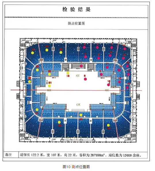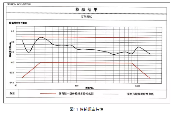 施工完毕后,进行了现场实测,测点如图10所示。经现场测试,扩声系统声压级可基本达到设计值,其他测量结果见图11、表2—表4。测试结果反映,该项目达到设计目标及行业相关标准指标。