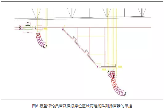 对于声场的设计,扬声器系统既考虑主席台区的覆盖,又要考虑整个观众区的覆盖;在扬声器选型上,要符合重量要轻、体积小、声压大等性能,以满足承重、避免建声缺陷、提高语言清晰度、避让视频照明等其他设备等一系列的相关要求。通过仿真软件NS-1模拟设计,确定扬声器数量、吊挂高度、投射角度等,以达到体育建筑设计规范一级指标,声压级为105 dB,语音清晰度指数不小于0.5,声场模拟点位如图3所示。不同的区域根据实际的面积、纵深覆盖需求,对线阵列扬声器的数量、分频、吊挂角度与高度进行配置。主扩声扬声器系统采用14组双12英寸三分频无源全频线阵列扬声器,吊挂覆盖整个观众区。其中,北侧方向共分8组,每组根据覆盖区域分别由2~8只扬声器单元组成;东西方向各1组,每组4只扬声器单元;南侧方向共分4组,每组根据覆盖区域分别由4~8只扬声器单元组成。扬声器布置平面图如图4所示。以评论员席以及播报席区域为例,由于区域观众席第一排至最后一排的高差为15 m,如图5所示,因此使用了2组线阵列扬声器进行覆盖,分别使用了4只、7只扬声器单元,其吊挂角度、高度分别为-7°、20.5 m,-2°、17.9 m,如图6所示。