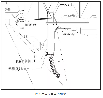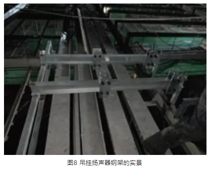 在扬声器系统吊挂过程中,由于首都体育馆保留了原有大顶球型网架结构、马道,在球型网架的结构下还有铝板造型结构以及龙骨,而扬声器系统的吊挂点位于大厅顶层铝板之上,需要穿过结构下悬杆、铝板和铝板固定龙骨层,避开灯光线路以及马道,并且每一组线阵列扬声器的安装位置不相同,需要精确的定位,以满足现场覆盖的范围及角度。基于这种情况,在进行了实地勘察测量后,经各方讨论,最后选择了单独设计安装钢结构吊点的吊挂方式。根据现场不同的位置,定制吊挂扬声器的钢架,如图7、图8、图9所示,吊挂高度可以在钢架上调整。这一结构不仅可以避开场地照明光路等,还可以应对施工过程中马道等一些设施的更改。