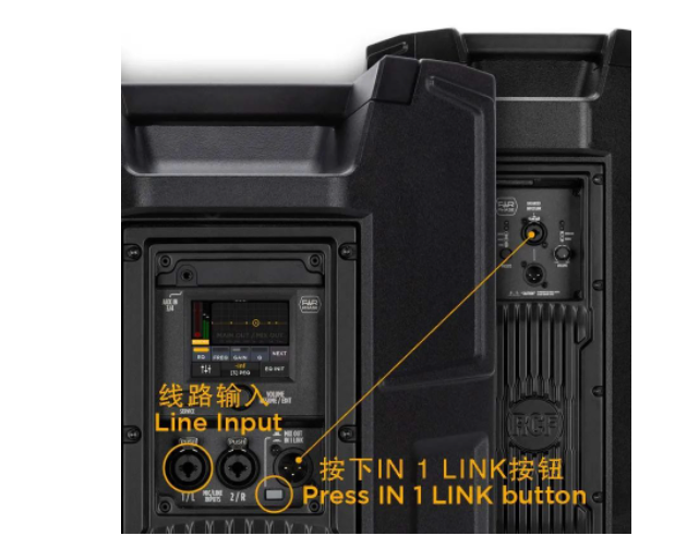只需按下按钮"IN 1 LINK",输入1/L上的信号就会直接发送到输出端。用于为其他扬声器提供信号。