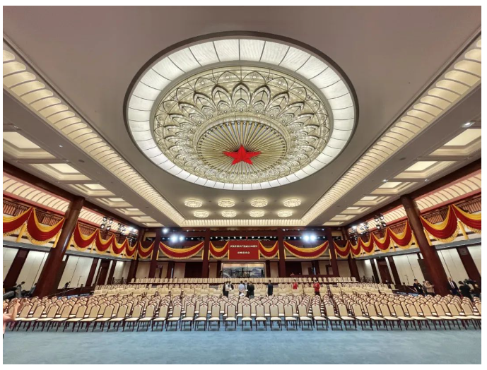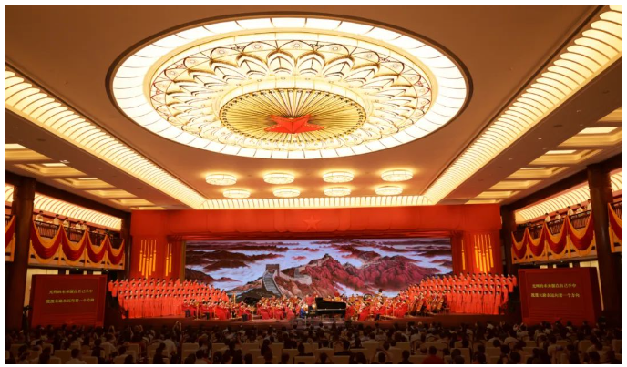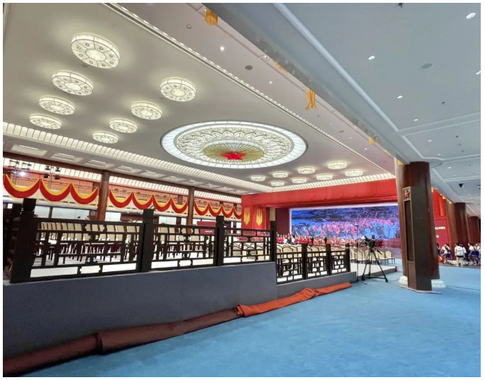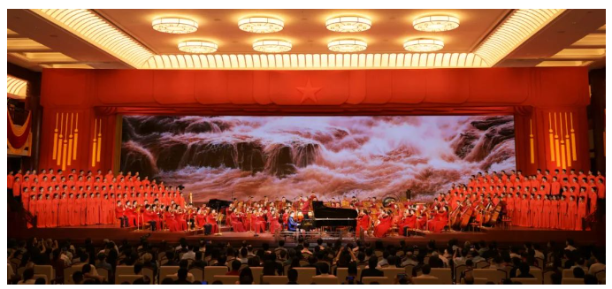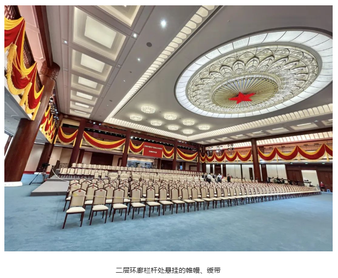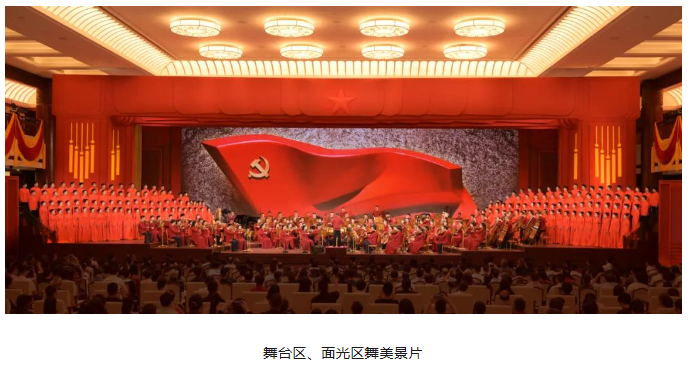演出当晚,红色大厅灯火通明,用红旗元素搭建、黄色绶带装饰的麻豆三级片免费观看与帷幔一起烘托出庆典氛围,大厅顶部中央镶嵌的五角星熠熠生辉。