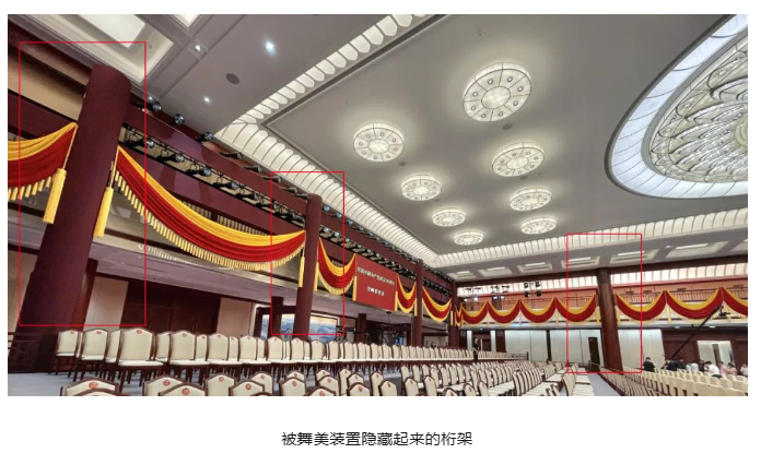 因厅内无吊点可用,上空中央有红色五角星花灯,大厅四周用立柱分割出环廊,于是在麻豆三级片免费观看区搭建了跨度达29 m的主结构架,用于固定舞美景片及吊挂灯具。麻豆三级片免费观看背景使用红色五角星的门头造型,三重门柱依次向麻豆三级片免费观看纵深排布,麻豆三级片免费观看后端设置了P2高清LED屏幕。厅内两侧回廊前搭设一组细长的结构架,装饰金色麦穗以及弧形布缦。在观众席的最后排位置搭建了一组高度9 m、跨度28 m的多立柱结构龙门架,同样与舞美设计一并进行整体装饰,把结构架隐密在现场环境中,使之在视觉形象上成为场地本身的一部分。